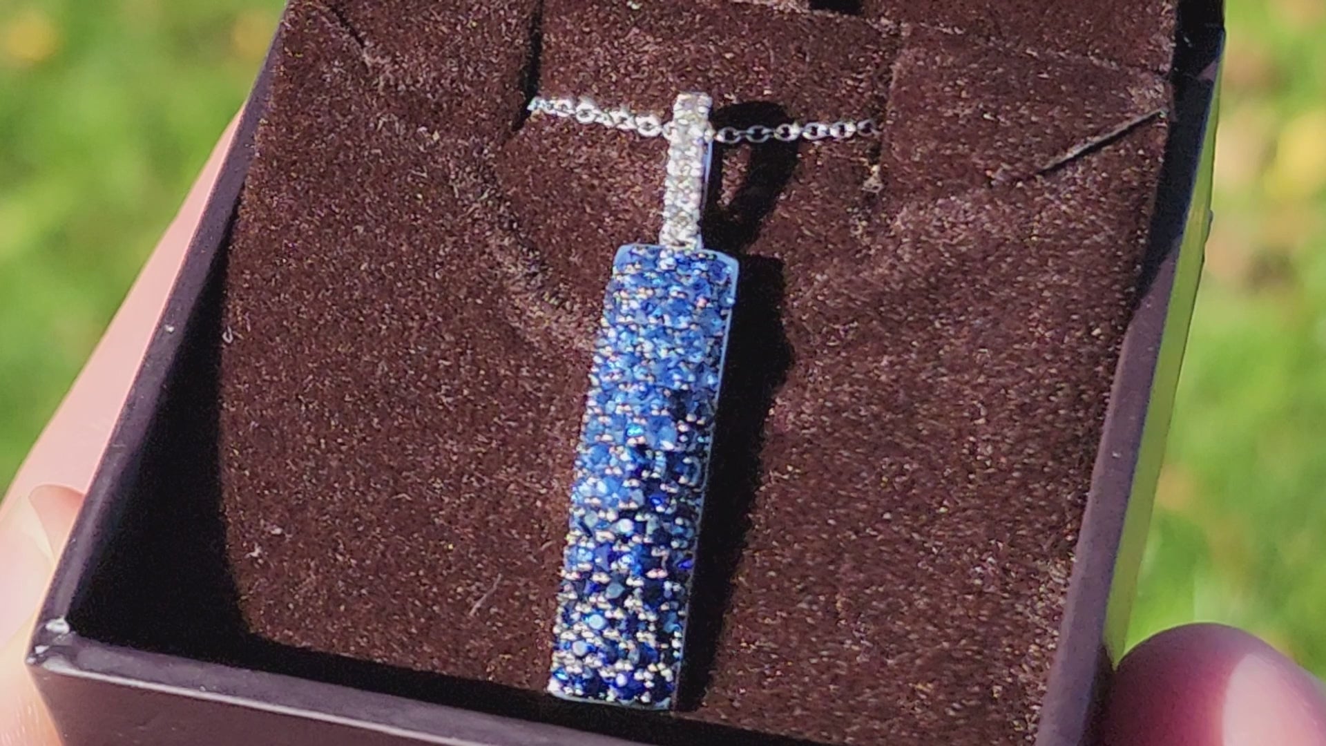 Le Vian Blueberry Sapphire and Diamond Dangle Pendant Featuring 1.16 Carats Total Weight of Pave Set Blueberry Sapphires and 0.46 Carats Round Cut Diamonds Creating an Ombre Pattern.