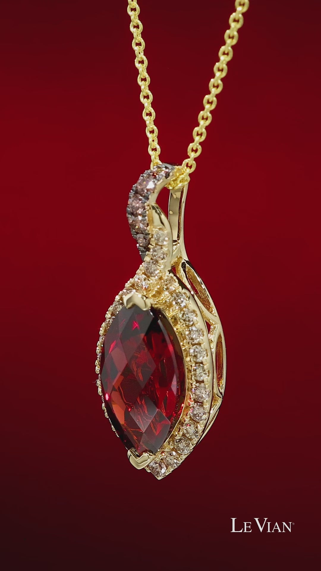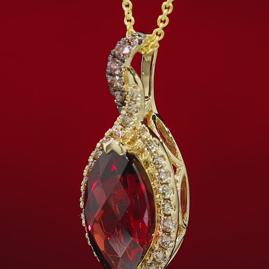 Le Vian Chocolatier Marquise Cut Pomegranate Garnet Pendant Featuring a 2.00 Carat Marquise Cut Garnet Gemstone with 0.27 Carats Round Cut Vanilla Diamonds Set in the Halo and Chocolate Diamonds Set in the Bale of the Pendant.