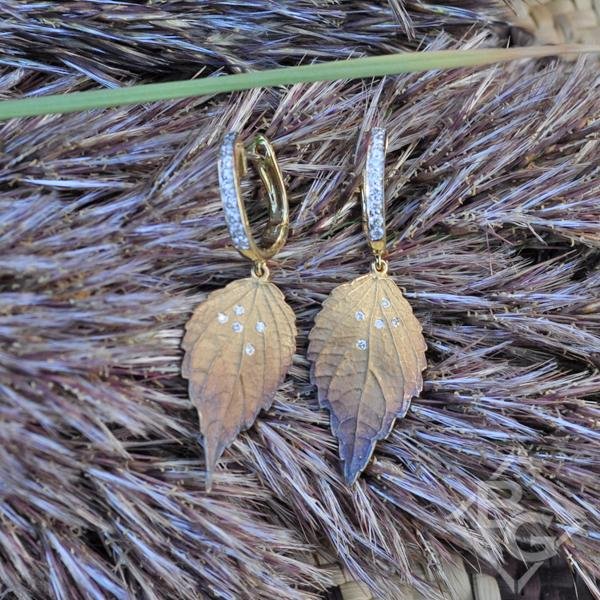 Simon G. 18K Yellow Gold Organic Allure Diamond Dangle Leaf Earrings Featuring 0.20 Carats Total Weight Round Cut Bezel Set Diamonds