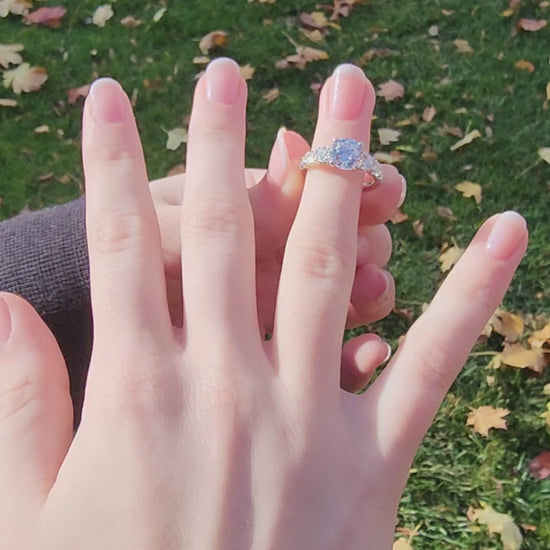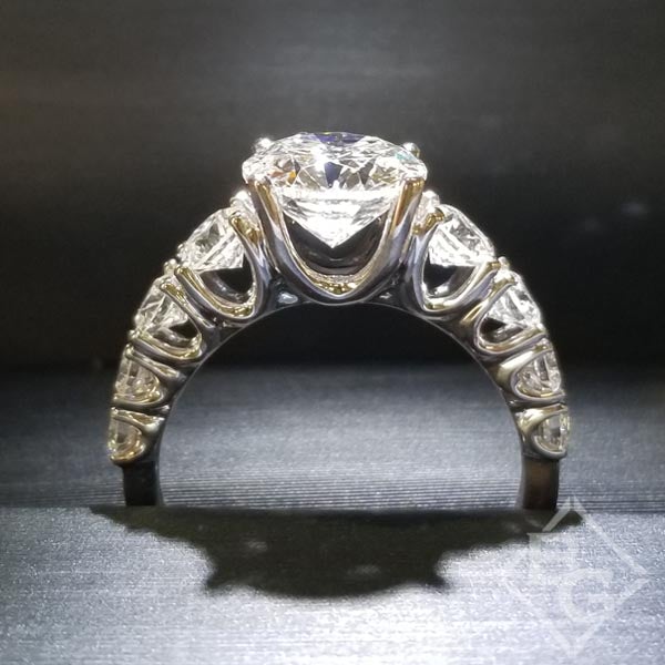 - Ring can accommodate any size or shape diamond. Shown with a 2.00 carat round (approximately 8mm)