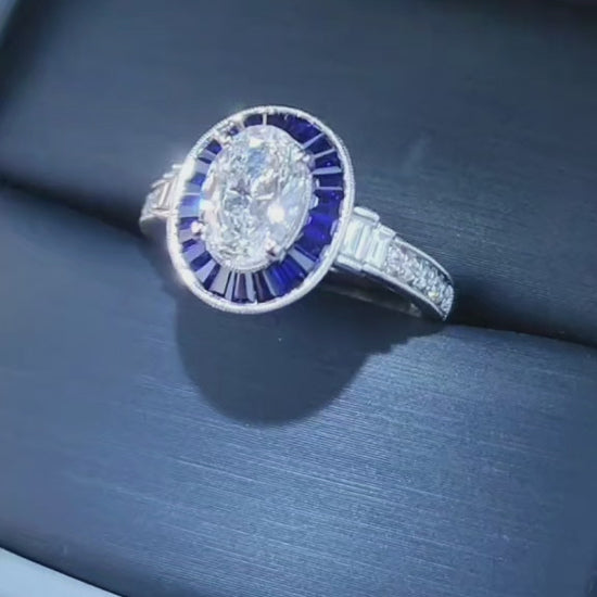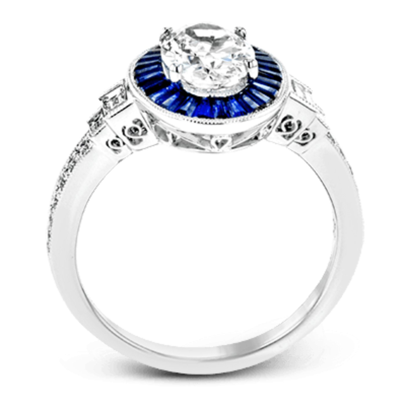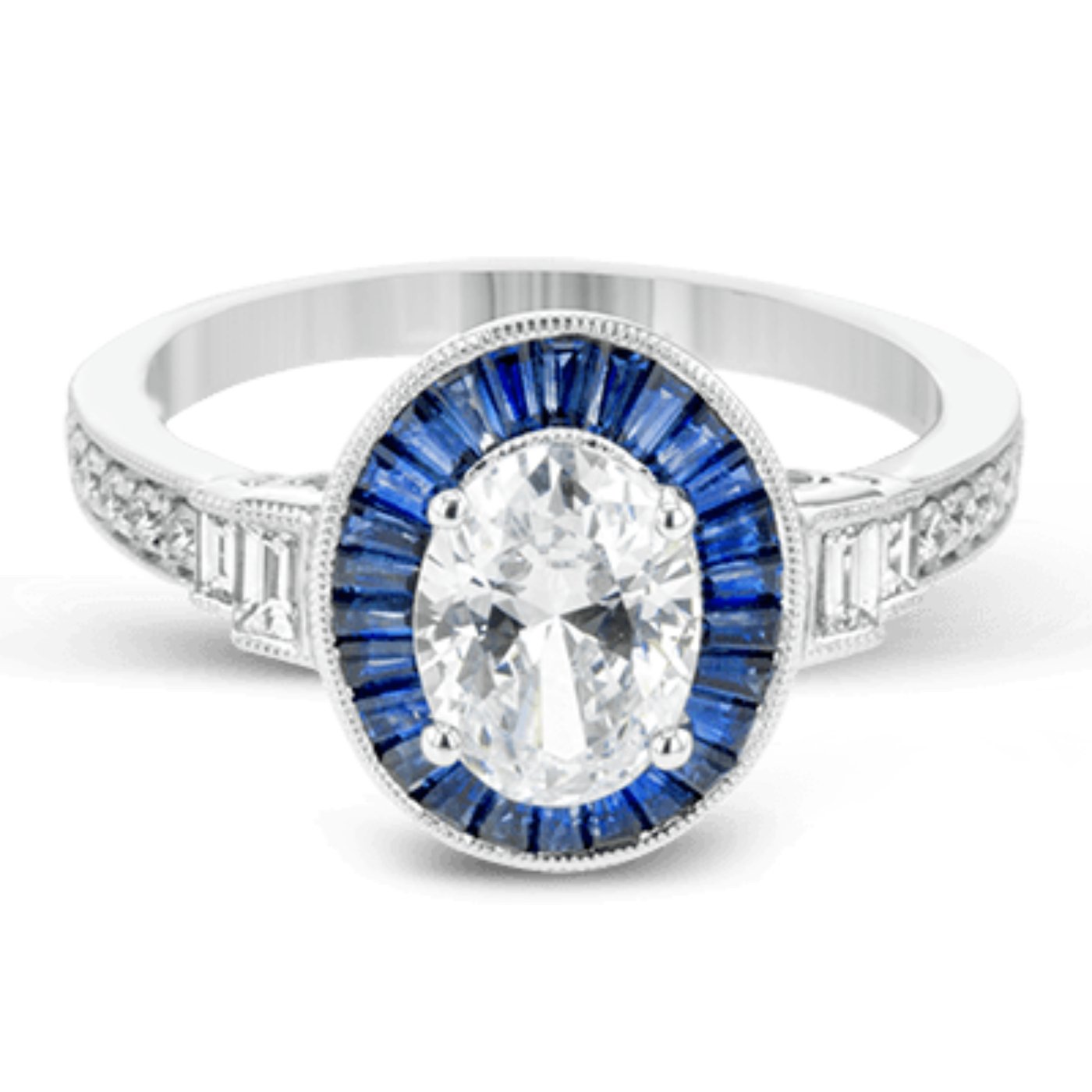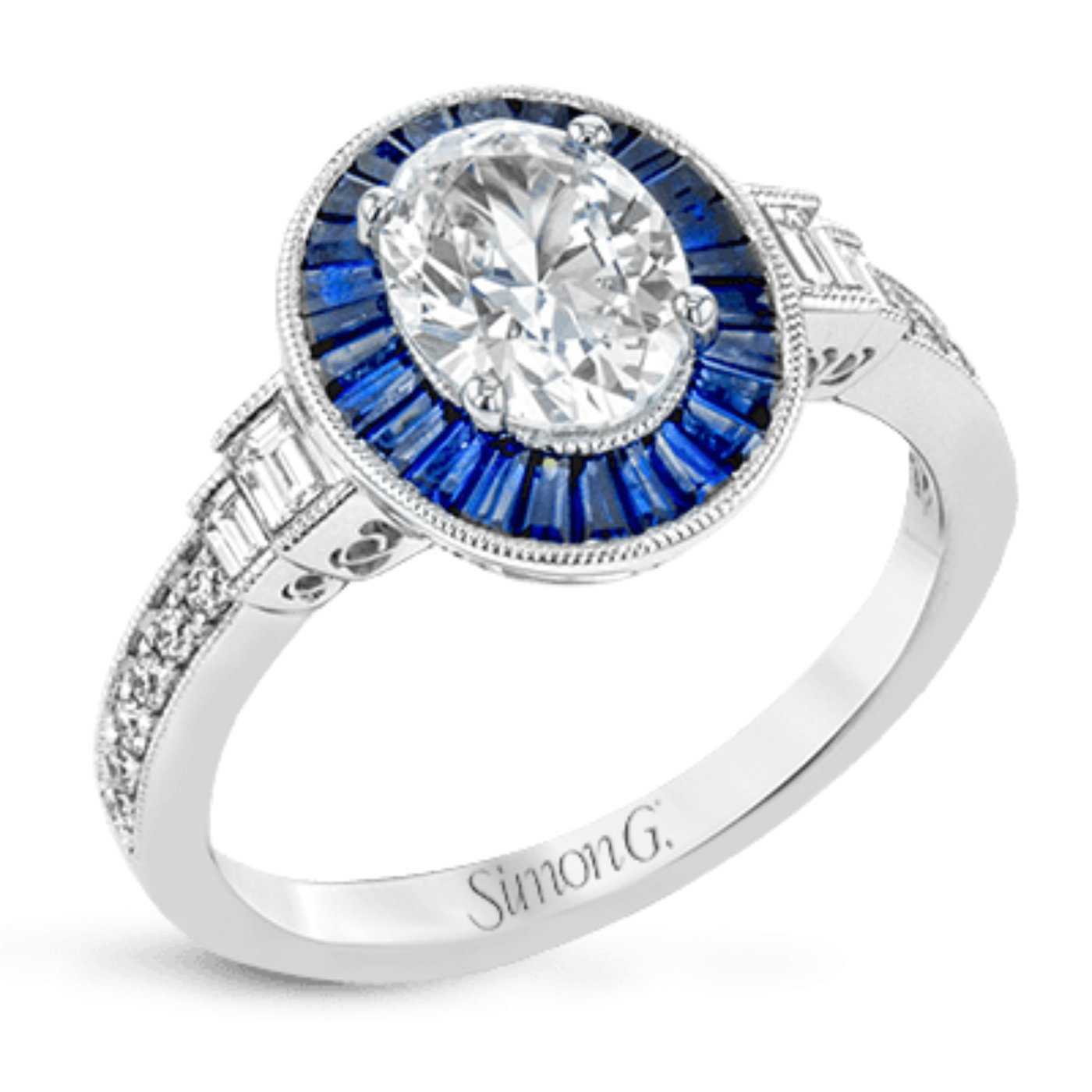 Simon G. Oval Cut Blue Sapphire Baguette Halo Diamond Engagement Ring