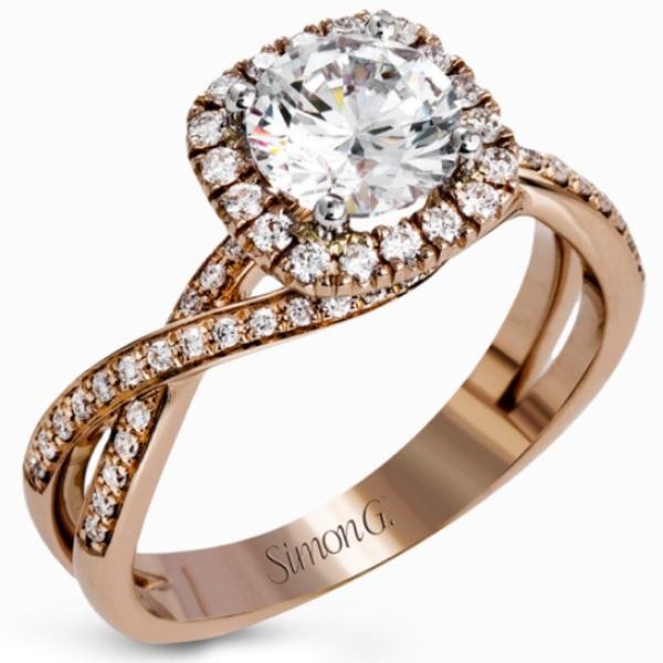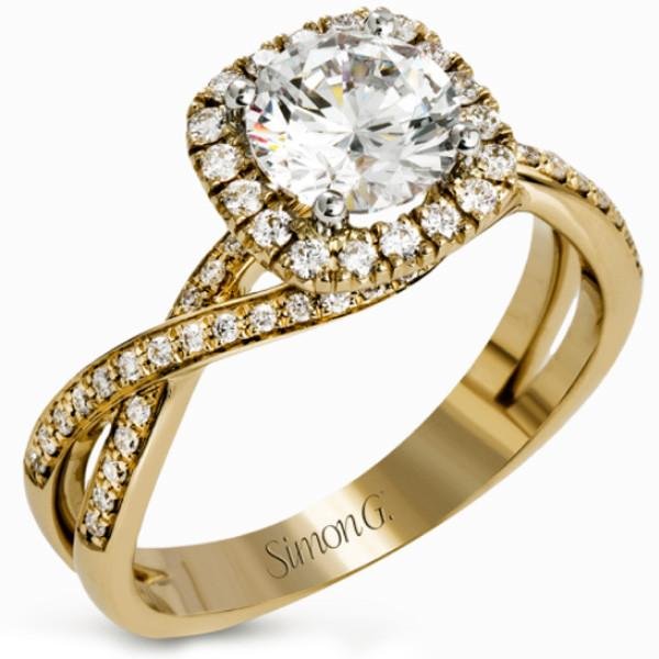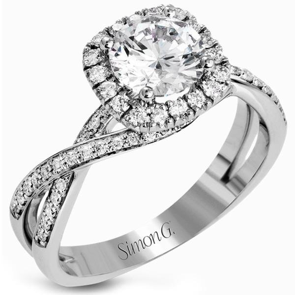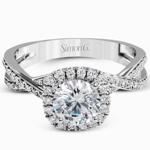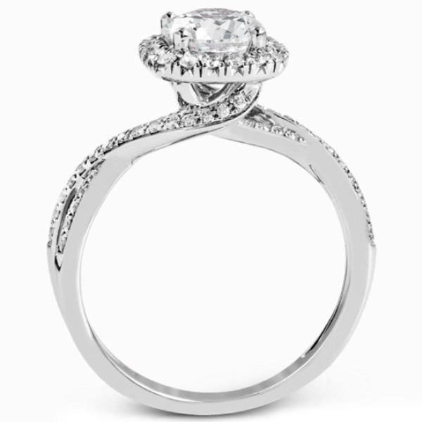 Simon G. Round Cut "Twist" Halo Split Shank Diamond Engagement Ring Featuring 0.29 Carats Prong Set Round Diamonds
