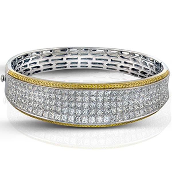 Simon G. 18K White & Yellow Gold Two-Tone Simon Set Diamond Bangle Bracelet Featuring 13.64 Carats Total Weight Princess Cut White Diamonds and 0.75 Carats Natural Fancy Yellow Diamonds