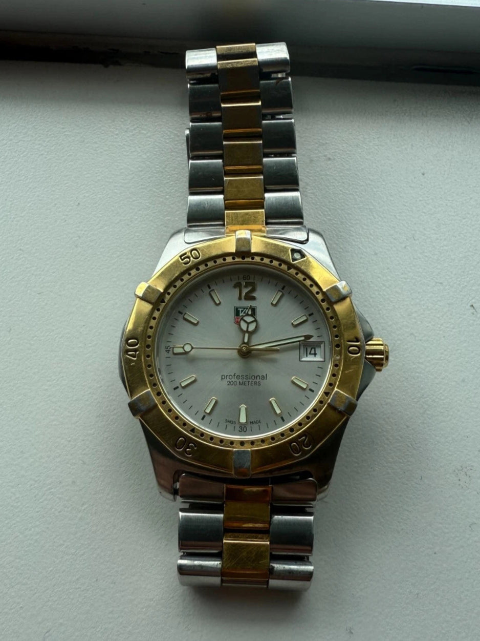This pre-owned TAG Heuer Professional WK1120 watch is a stylish and dependable timepiece featuring a clean white dial, gold-tone accents, and a durable 38mm stainless steel case. The classic two-tone bracelet and unidirectional gold bezel give it a polished, versatile look—perfect for both everyday wear and special occasions.