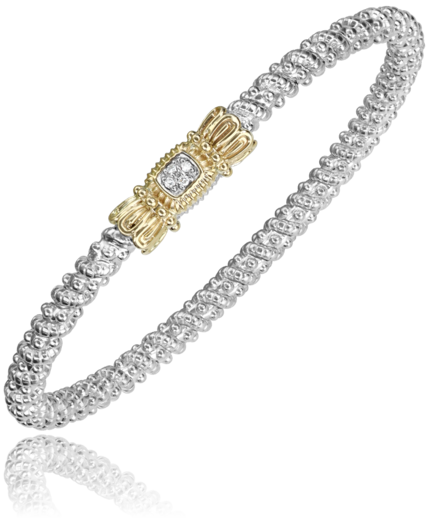 Effortlessly elegant, this Vahan 3MM two-tone closed flexible bangle blends timeless craftsmanship with refined sparkle. Handcrafted in sterling silver with rich 14K yellow gold accents, the bracelet features Vahan’s signature Moiré Beaded® pattern—an iconic texture that adds depth and dimension.