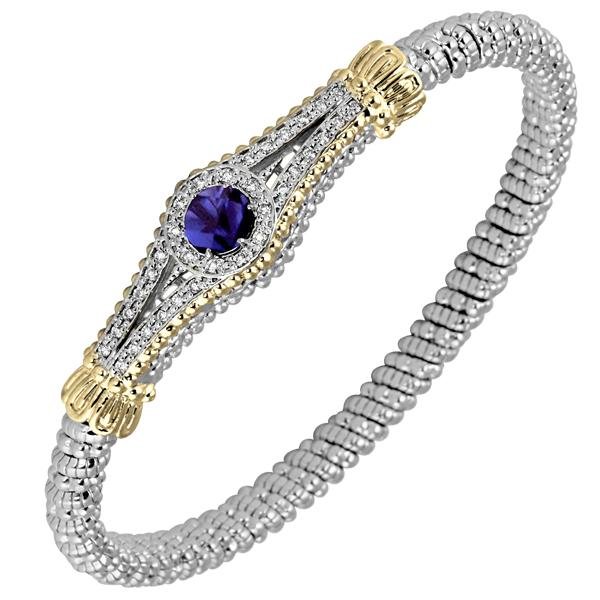 Vahan 4MM Two-Tone 14K Yellow Gold & Sterling Silver "Art Deco" Style Bangle Bracelet Featuring One Round Cut Purple Colored Iolite Gemstone and 0.28 Carats Total Diamond Weight Round Cut Diamonds